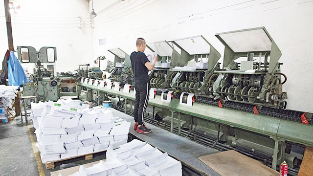公司擁有粘帖機(jī)1臺(tái),高頻機(jī)1臺(tái),四頭騎馬訂書機(jī)1臺(tái),混合式折頁(yè)機(jī)2臺(tái),模切機(jī)1臺(tái),鎖線機(jī)2臺(tái)。